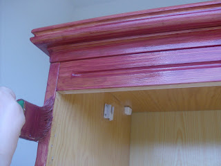 Desaparafusei as portas; lixei a madeira no sentido das fibras com lixa de grão 80 para eliminar o verniz incolor; limpei a superfície com um pano húmido; apliquei uma demão de proteção para madeiras (Woodtec Lasures da CIN, vermelho ginja); voltei a lixar com lixa de grão fino, dei nova demão com o produto CIN e apliquei três puxadores (Zara Home).